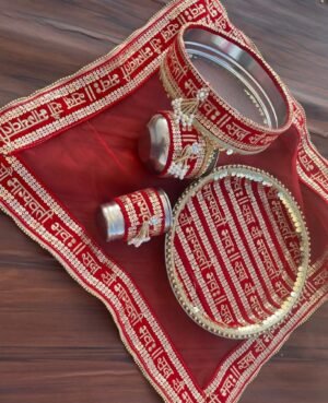 Red Karva Chauth Bhaav Thali Combo Set in Sada Saubhagwati Bhava Lace